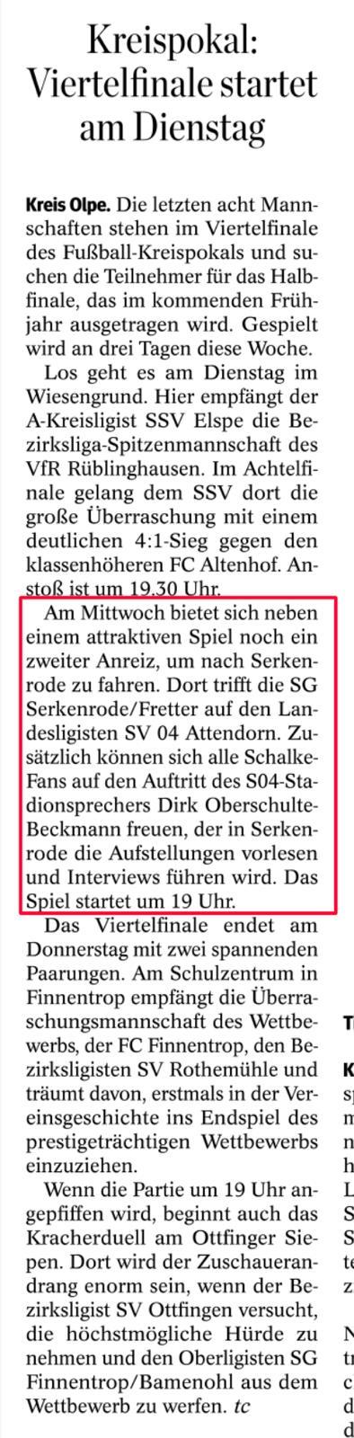 Kreispokal: Viertelfinale „… Am Mittwoch bietet sich neben einem attraktiven Spiel noch ein zweiter Anreiz, um nach Serkenrode zu fahren. ..“