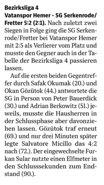 Vatanspor Hemer 5:2 (2:1) SG Serkenrode/Fretter, Tore: Peter Bauerdick, Adrian Berkowitz