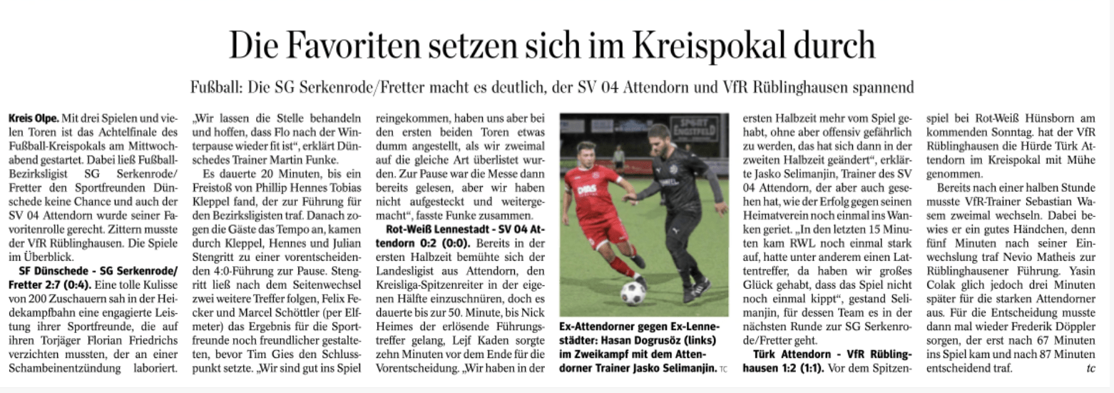 Die Favoriten setzen sich im Kreispokal durch. Die SG Serkenrode/Fretter macht es deutlich, der SV 04 Attendorn und VfR Rüblinghausen spannend.